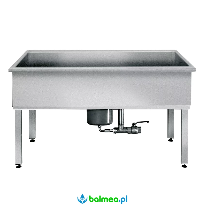 Otwór w dnie niecki wyposażony w przyspawany spust uzupełniony osadnikiem szlamu ze stali szlachetnej. Przelew z podłączeniem G 1 1/2 B oraz króciec odpływowy G 1/2 B. Zestaw odpływowy z kurkowym zaworem kulowym i przyłączem G 1/2 B. Kompletne orurowanie. Podstawa z rur czworokątnych ze stali szlachetnej, nogi z regulacją wysokości.
