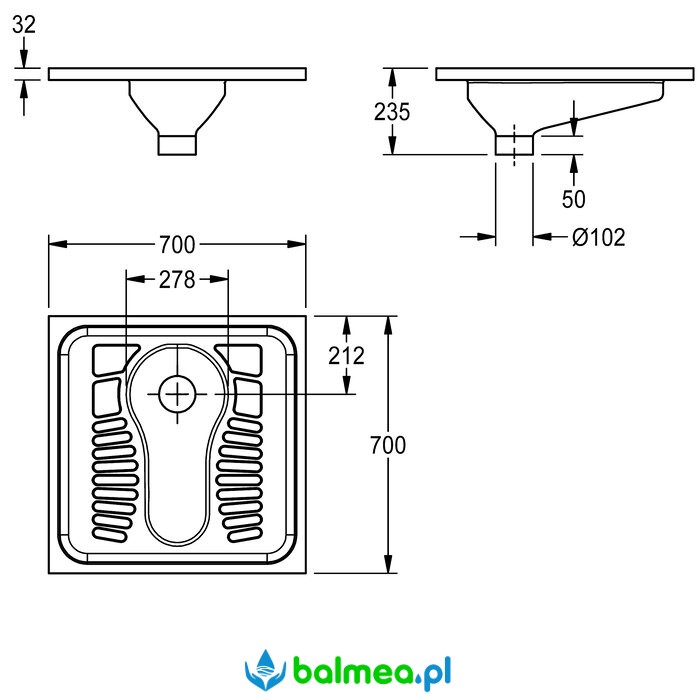 Stalowa miska WC kucana o wymiarach 700 x 235 x 700 mm