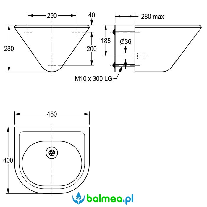 Stalowa umywalka pojedyncza do montażu ściennego o wymiarach 450 x 280 x 400 mm