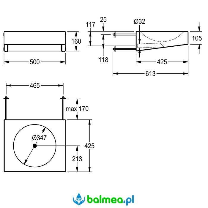 Stalowa umywalka pojedyncza do montażu ściennego o wymiarach 500 x 160 x 425 mm