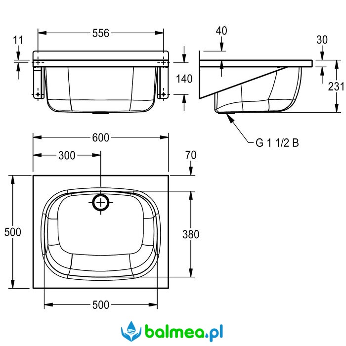 Niecka komory jest wspawana bezspoinowo, a naroża zaokrąglone. Wyposażona w półkę o wysokości 70 mm pod armaturę oraz tylną listwę o wysokości 40 mm. Przelew rurkowy wykonany z tworzywa sztucznego G 1 1/2 B, odpływ tylny środkowy. Zintegrowane wsporniki ścienne. W komplecie znajduje się zestaw montażowy.