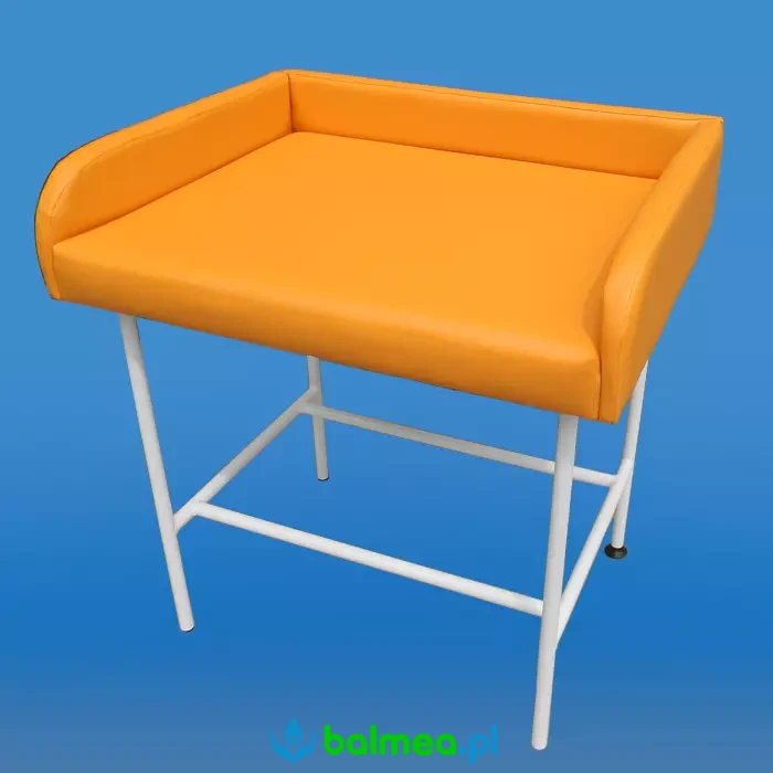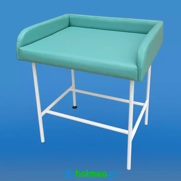Wolnostojący stolik do przewijania i przebierania niemowląt, a także stanowisko do suchego masażu małych dzieci. Tapicerowany przewijak zamocowany na stelażu wykonanym ze stalowych rurek polakierowanych na biało. Dodatkowo przewijak posiada stopkę umożliwiającą wypoziomowanie w przypadku nierówności powierzchni podłogi. Idealnie sprawdza się w budynkach użyteczności publicznej w szczególności w placówkach opieki medycznej poczekalniach, gabinetach lekarskich, przychodniach.