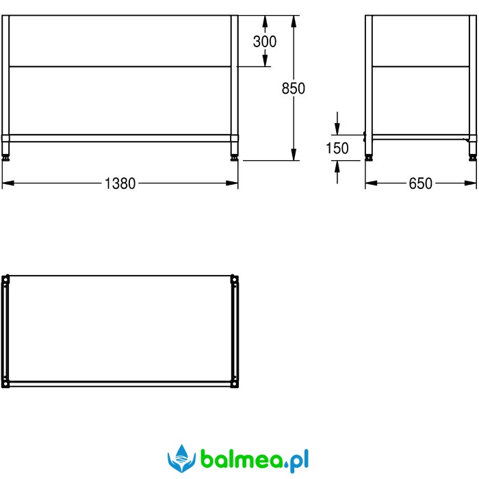 Stelaż do montażu zlewozmywaka przemysłowego KWC, wykonany ze stali szlachetnej o matowej powierzchni i grubości 1 mm. Wyposażony w fartuchy o wysokości 300 mm, nóżki 40 × 40 mm z regulacją wysokości w zakresie 25 mm oraz poprzeczkę stabilizującą z tyłu. W komplecie znajduje się zestaw montażowy.