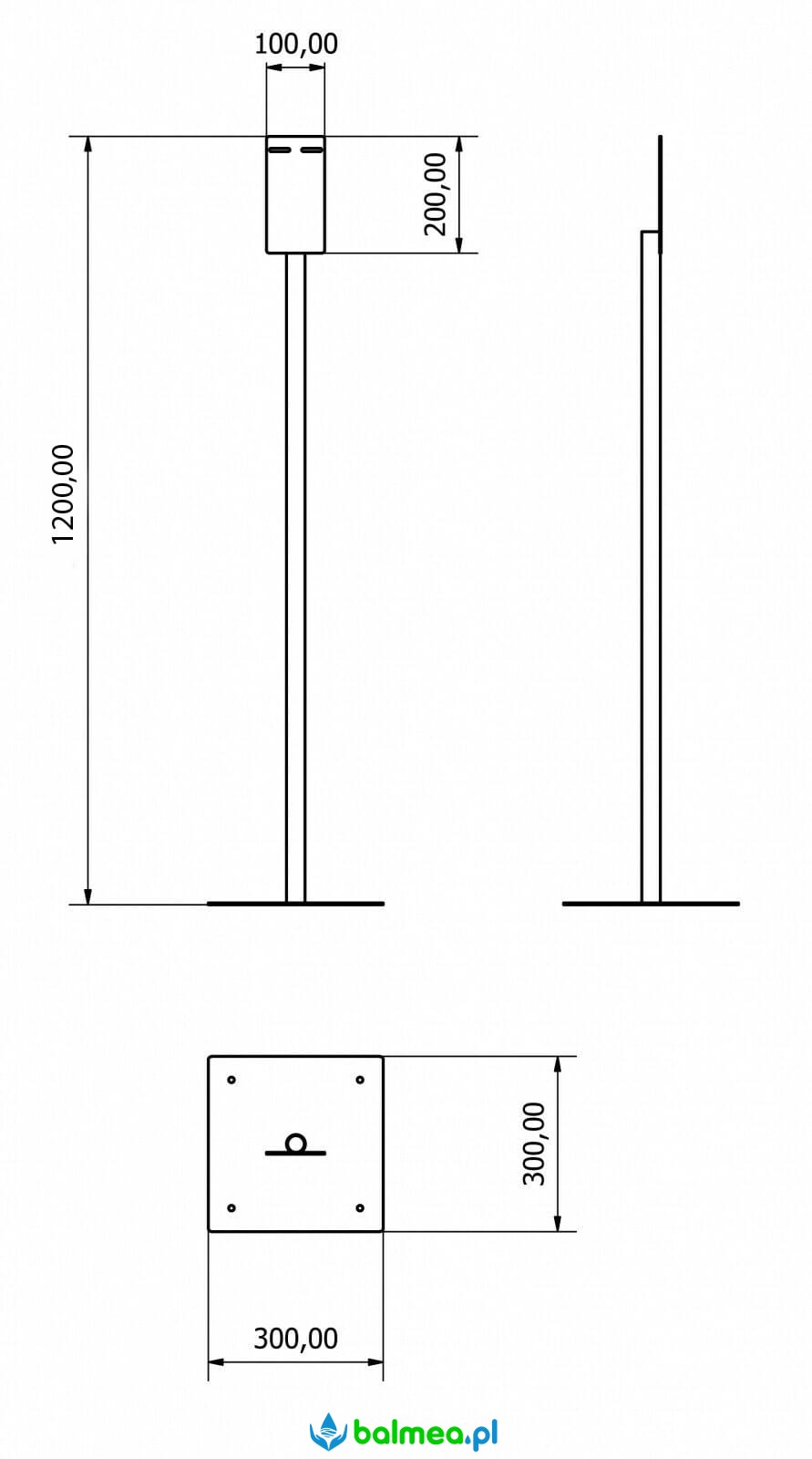 o wykończeniu matowym. Wysokość 120 cm, podstawa 30x30 cm. Dół podstawy posiada otwory montażowe.