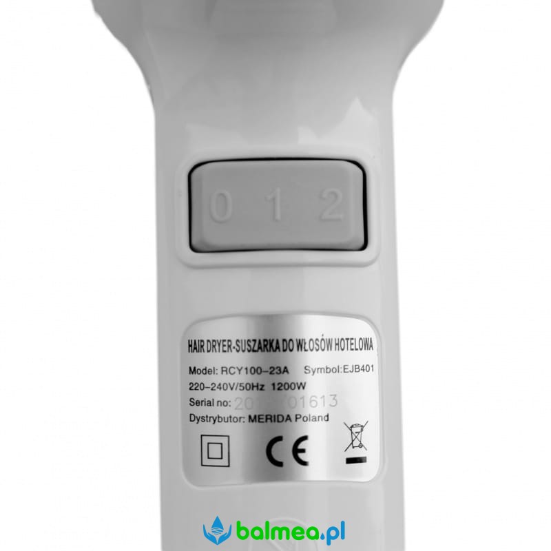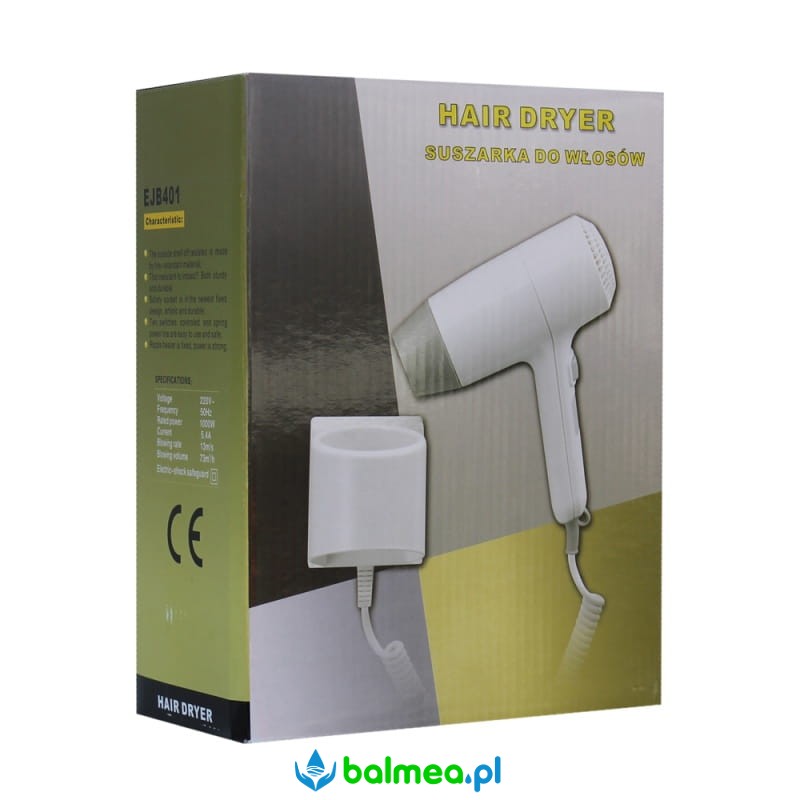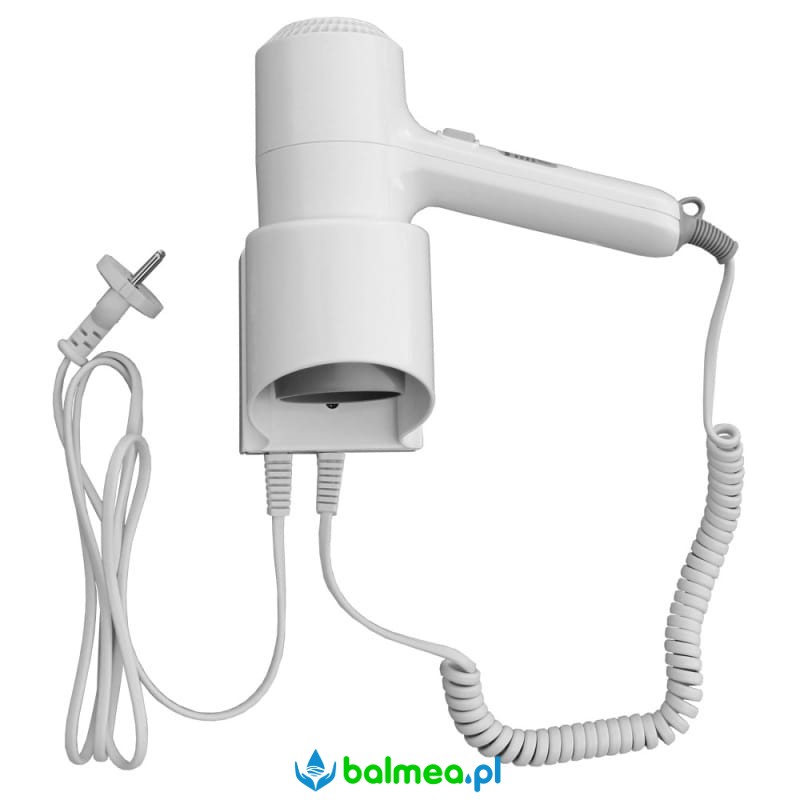 Suszarka do włosów, wykonana z mocnego tworzywa sztucznego w kolorze białym. Przeznaczona do stosowania w łazienkach domowych, hotelowych, w pensjonatach itp. Urzadzenie posiada włącznik z możliwością ustawienia mocy i prędkości wypływu powietrza. W komplecie uchwyt ścienny, umożliwiający zawieszenie. W uchwycie znajduje się wyłącznik, który powoduje automatyczne wyłączenie suszarki po jej odwieszeniu. Suszarka łatwa w montażu, wyposażona w przewód zasilający z wtyczką.