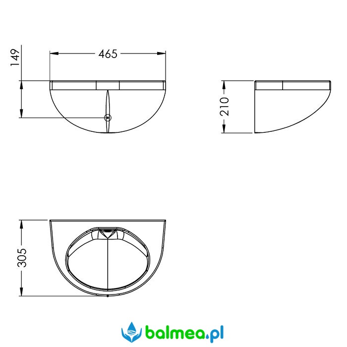 Umywalka pojedyncza do montażu ściennego z tworzywa sztucznego o wymiarach 465 x 210 x 305 mm