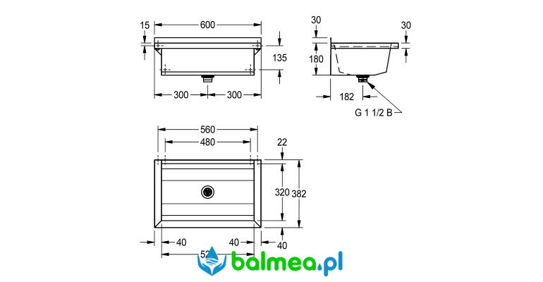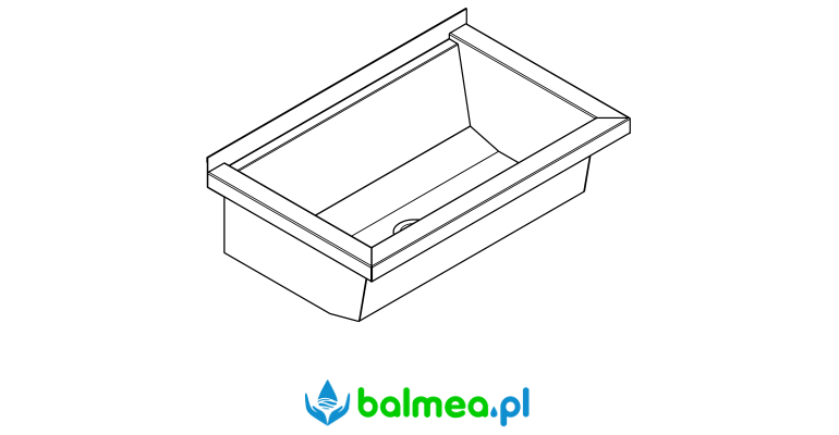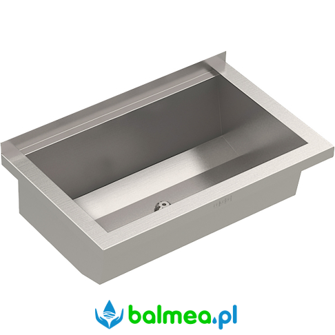 do montażu ściennego. Wykonana ze stali szlachetnej chromowo-niklowej o wykończeniu matowym. Grubość materiału umywalki 0,8 mm, ścianek bocznych 1,2 mm. Spawana bezspoinowo. Ścianki boczne ze zintegrowanymi wspornikami ściennymi. Bez półki na armaturę i bez przelewu. Listwa tylna 30 mm. Centralny odpływ, zawór sitkowy G 1 1/2B. W zestawie materiały montażowe.