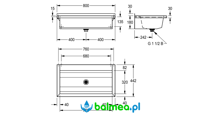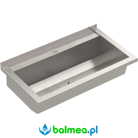 do montażu ściennego. Wykonana ze stali szlachetnej chromowo-niklowej o wykończeniu matowym. Grubość materiału umywalki 0,8 mm, ścianek bocznych 1,2 mm. Spawana bezspoinowo. Ścianki boczne ze zintegrowanymi wspornikami ściennymi. Półka armaturowa obniżona 80 mm, bez otworu na armaturę i bez przelewu. Listwa tylna 30 mm. Centralny odpływ, zawór sitkowy G 1 1/2B. W zestawie materiały montażowe.