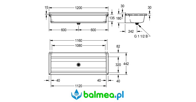 do montażu ściennego. Wykonana ze stali szlachetnej chromowo-niklowej o wykończeniu matowym. Grubość materiału umywalki 0,8 mm, ścianek bocznych 1,2 mm. Spawana bezspoinowo. Ścianki boczne ze zintegrowanymi wspornikami ściennymi. Półka armaturowa obniżona 80 mm, bez otworu na armaturę i bez przelewu. Listwa tylna 30 mm. Centralny odpływ, zawór sitkowy G 1 1/2B. W zestawie materiały montażowe.
