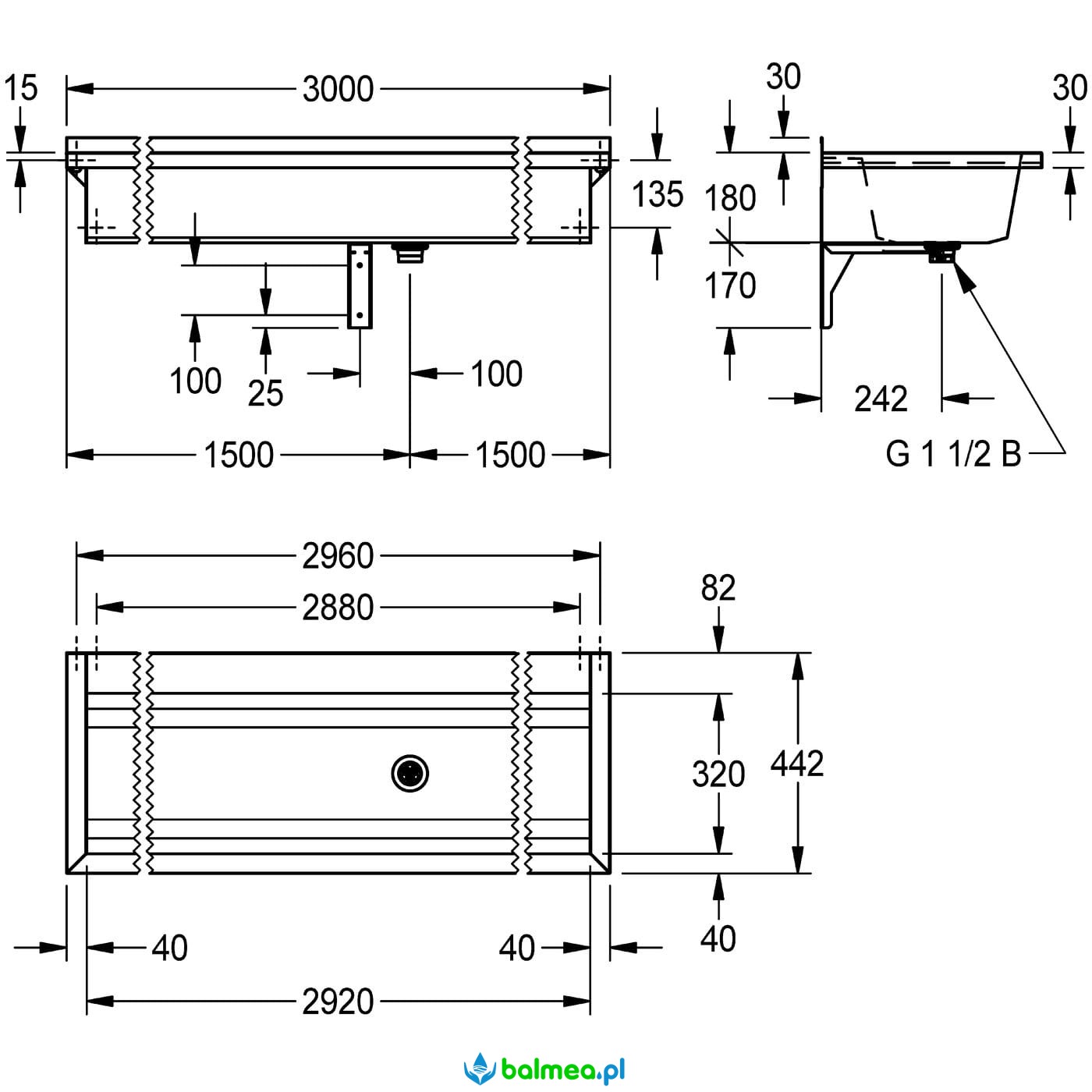 Samonośna do montażu ściennego. Ścianki boczne ze zintegrowanymi wspornikami ściennymi. Wykonana ze stali szlachetnej chromowo-niklowej AISI 304 o matowym wykończeniu powierzchni. Grubość materiału umywalki 0,8 mm, ścianek bocznych 1,2 mm. Spawana bezspoinowo. Półka armaturowa obniżona 80 mm, bez otworu na armaturę i bez przelewu. Listwa tylna 30 mm. Centralny odpływ, zawór sitkowy G 1 1/2B. Przy długości powyżej 1800 mm w komplecie dodatkowy wspornik. W zestawie materiały montażowe.