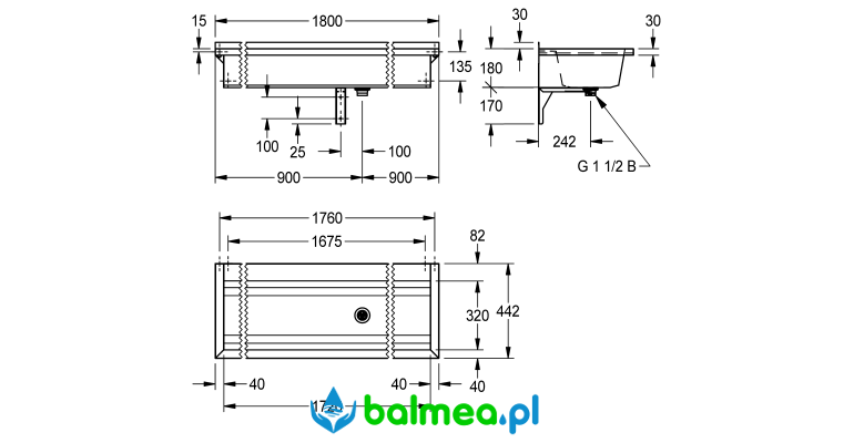 do montażu ściennego. Wykonana ze stali szlachetnej chromowo-niklowej o wykończeniu matowym. Grubość materiału umywalki 0,8 mm, ścianek bocznych 1,2 mm. Spawana bezspoinowo. Ścianki boczne ze zintegrowanymi wspornikami ściennymi. Półka armaturowa obniżona 80 mm, bez otworu na armaturę i bez przelewu. Listwa tylna 30 mm. Centralny odpływ, zawór sitkowy G 1 1/2B. W zestawie materiały montażowe.