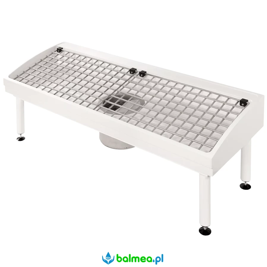 Urządzenie do mycia butów i kaloszy wykonane z kompozytu mineralnego MIRANIT, spajanego żywicą syntetyczną, o gładkiej, nieporowatej powierzchni odpornej na temperaturę do 80 °C. Montaż przy ścianie. Duże promienie wewnętrzne, dno niecki ze spadkiem 2°. Kolor biały alpejski. Odpływ z podłączanym przez klienta syfonem, z odkręcanym koszem na osad z nierdzewnej stali, obracany o 90°. Każde stanowisko wyposażone w odchylaną kratownicę ze stali szlachetnej. Zespawana podstawa ramowa, powleczona proszkowo w kolorze niecki, nogi z regulacją wysokości. W komplecie materiały montażowe.