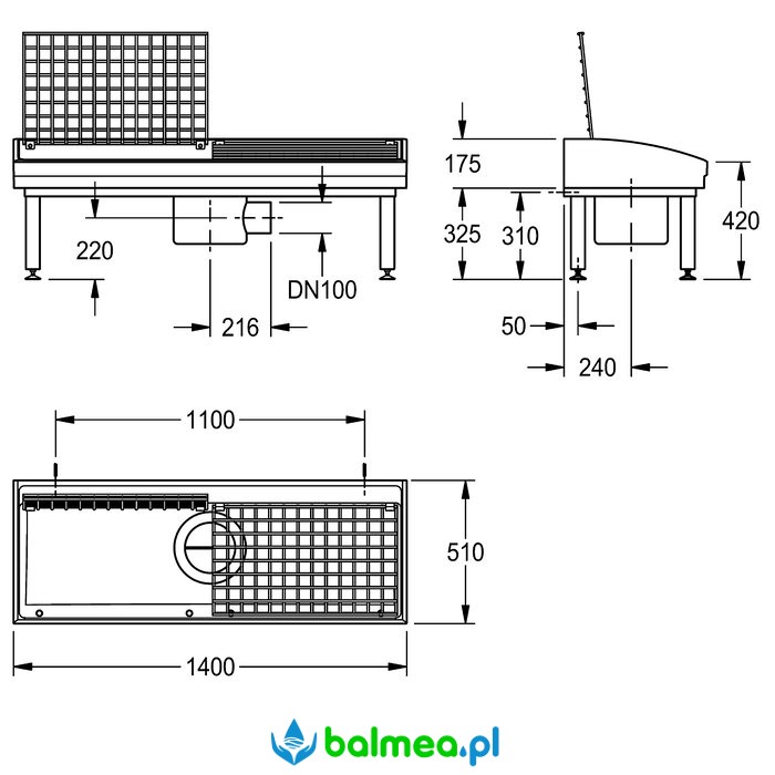 Wymiary całkowite: 1400 × 175/500 × 510 mm (szer. × wys. × głęb.)
