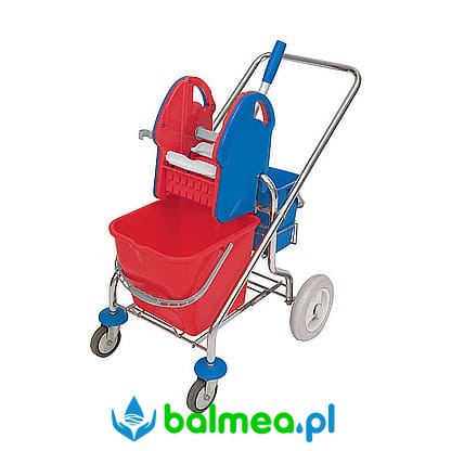 Bardzo funkcjonalny zestaw sprzątający do pracy między piętrami bez windy, gdzie zachodzi konieczność wciągania lub opuszczania całego wózka z wodą po schodach (np, gdy ujęcie wody jest tylko na jednym z pięter). W skład zestawu na konstrukcji z rur chromowanych i z dużymi kółkami wchodzą dwa wiadra o pojemności 20 litrów w czerwonym kolorze i 6 litrów w kolorze niebieskim oraz prasa do wyciskania mopa w czerwono-niebieskim kolorze. Dodatkowo możłiwość złożenia stelaża wózka na płasko, co ułatwia przechowywanie. Ten funkcjonalny wózek usprawni czyszczenie dużych powierzchni.