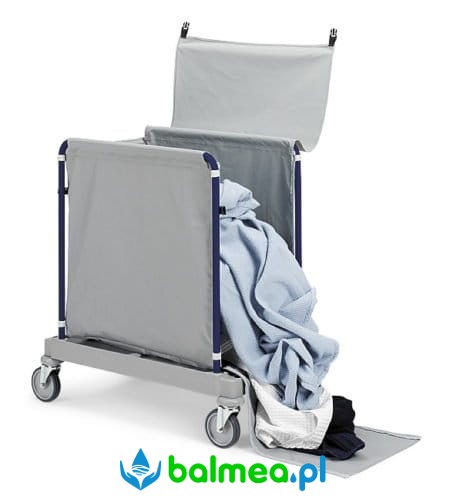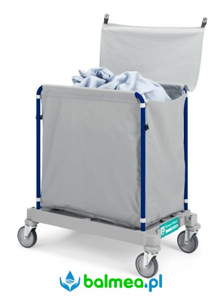 Wózek do zbierania i transportu bielizny brudnej w szpitalach, hotelach, pensjonatach. Wyposażony w cztery skrętne kółka, dzięki którym łatwo się go prowadzi. Worek z przykryciem zamykanym na rzep o pojemności 200L wykonany z materiału z tworzywa sztucznego odpornego na poplamienia i rozdarcia.