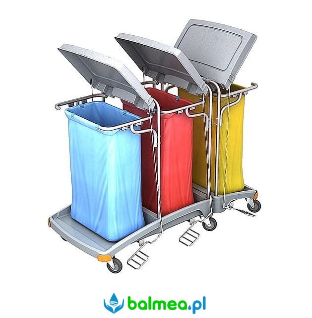 Funkcjonalny wózek na odpady, w którego skład wchodzi: wózek na kółkach z tworzywa sztucznego, trzy worki o pojemności 120 litrów w czerwonym, niebieskim i żółtym kolorze. Wózek posiada mechanizm podnoszenia pokryw wózka. Będzie pomocny przy sprzątaniu dużych powierzchni biurowych, hotelowych, szpitalnych ułatwiając segregację śmieci.