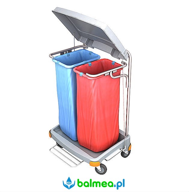 Funkcjonalny wózek na odpady, w którego skład wchodzi: wózek na kółkach z tworzywa sztucznego, dwa worki o pojemności 70 litrów w czerwonym i niebieskim kolorze oraz mechanizm podnoszenia pokrywy wózka.