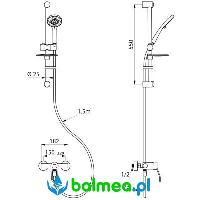 Zestaw zawiera słuchawkę natryskową na suwaku, chromowany drążek natryskowy z mydelniczką, wąż natryskowy oraz obręcz zabezpieczającą przed upadkiem słuchawki na posadzkę.