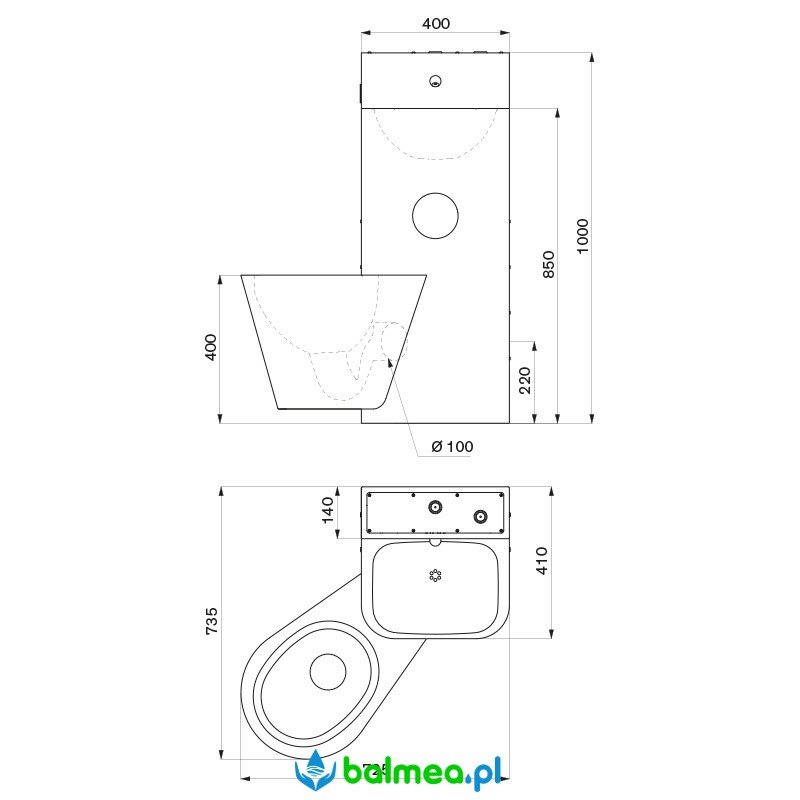 Podtynkowy, poziomy odpływ wody Ø100 mm.